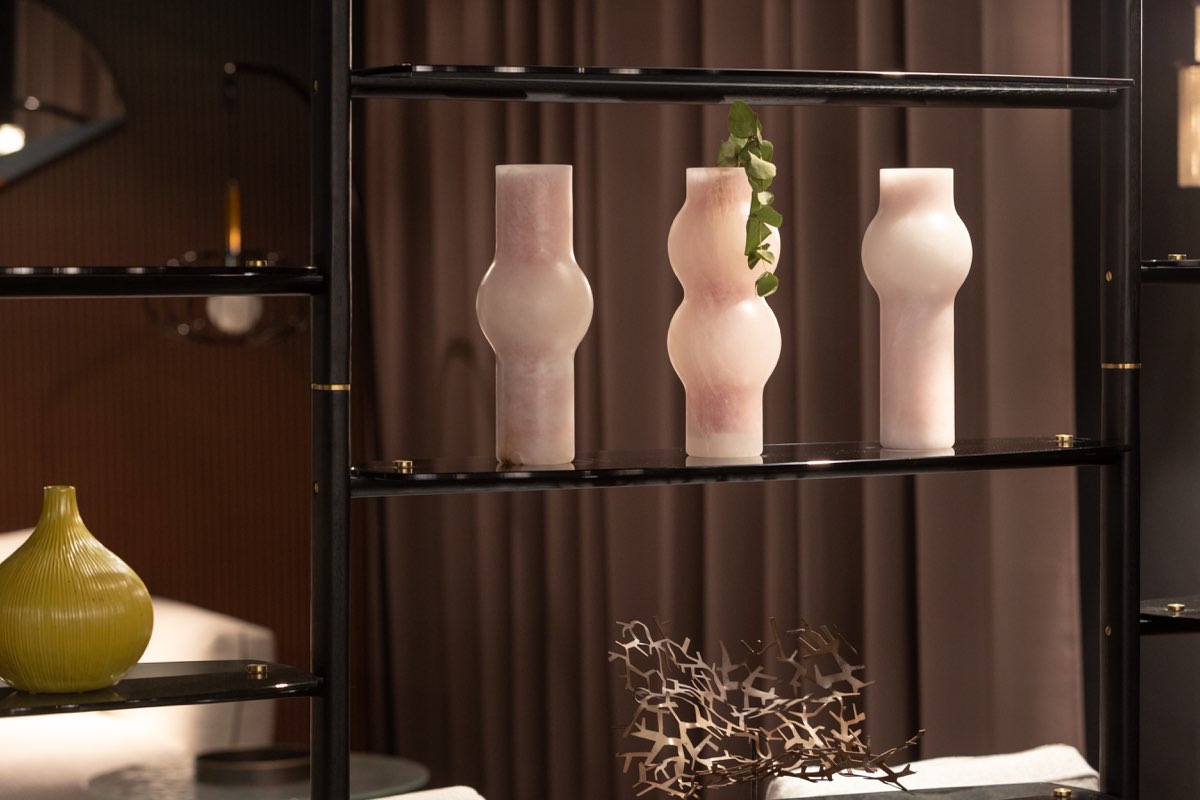 Un movimento delicato dell’aria che si sposta, sinuoso, dove la materia soffice avvolge talvolta nascondendo, talvolta mostrando ciò che ingloba. Fog è un richiamo alle suggestioni tattili e visive che la materia prima racconta al suo interno. Leggerezza, trasparenza e spessori minimi diventano protagonisti. Da una parte leggiamo un passaggio graduale e dall’altra la materia si eleva. Forme pure dalle linee morbide in cui la traslucentezza dell’alabastro conferisce spazialità all’oggetto.